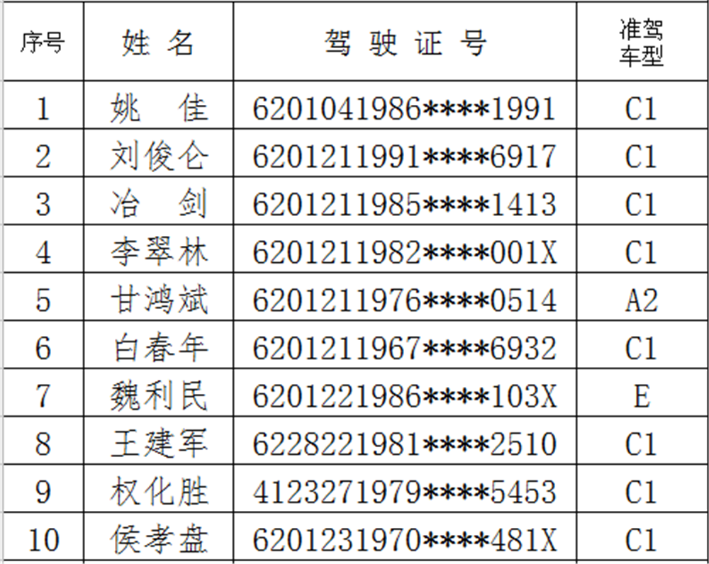 以下为50名醉驾司机名单: