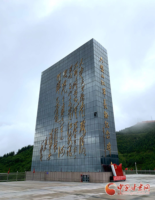 雨中的六盘山,满目葱茏,烟云缭绕……六盘山主峰之上,一座高12米、长60米,由3面红军军旗构成,镌刻着“长征精神永放光芒”八个大字的碑墙,隐约可见。绕过碑墙,拾级而上,就是六盘山红军长征纪念馆。