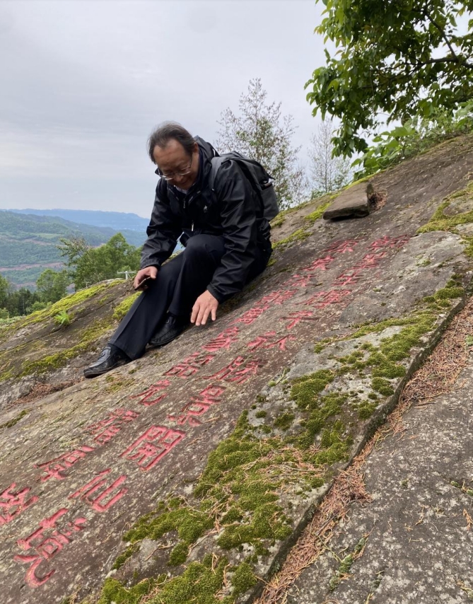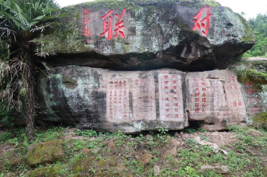 山上随处是石,或卧或立,俱有雄狮虎豹之势;或平或峻,皆作冈陵之态。青峰续脉,绝顶鹰飞。凿岩壁以造法像,栩栩如临宫阙;摩巨石而镌嘉联,文华直射牛斗。石多瑰伟,苔覆璞瑜,油菜花点缀其间,引来蜜蜂蝴蝶共舞。山茶与毛竹同畦,郁郁葱葱;峰峦与云烟共养,莽莽苍苍。遇目石上镌字,浏赏翰墨烟霞;振藻扬毫,皆寰中俊杰;椽笔斯文,多陇蜀贤达。或赤子肝胆,烛照于史;或凛然浩气,啸傲大千。联壁生辉,文曲星彰;峣岩开窍,气通神明。文采焕然与星河同辉,诗侪竞秀润厚山玉颜。壮怀诗梦,漱玉溪流。在一块巨石斜面上,有同伴发现刻有笔者所书长联,兴奋得喊叫起来。这是三年前应曹兴章先生之约而作,联曰:翰墨生辉,千秋胜景开仙境;源泉流韵,万象韶光耀厚山。我用手指扣去笔画生出的茂密青苔,坐下来与我的联合影留念。信是莲花开石上,遥遥至此结仙缘。