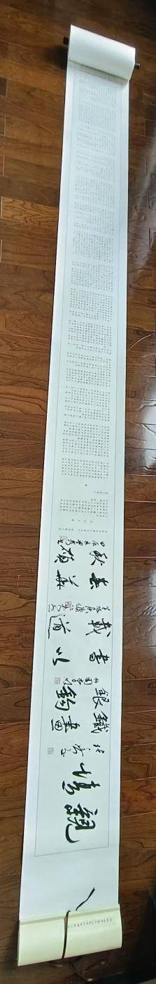 该长卷是白建新继200米硬笔书法长卷《蛙》之后的又一部力作。作者耗时一年四个月,用硬笔楷书在四尺对开的宣纸上创作的《海峡两岸著名作家系列 亲情散文卷》,字体严谨,书风纯正,字形一厘米见方,尽显欧楷风体。全篇近30万字,共分5卷,幅长达250米。