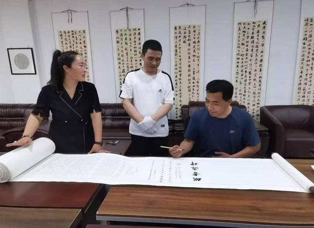 凯发k8省硬笔书法家协会主席焦满金(右一)为长卷题词