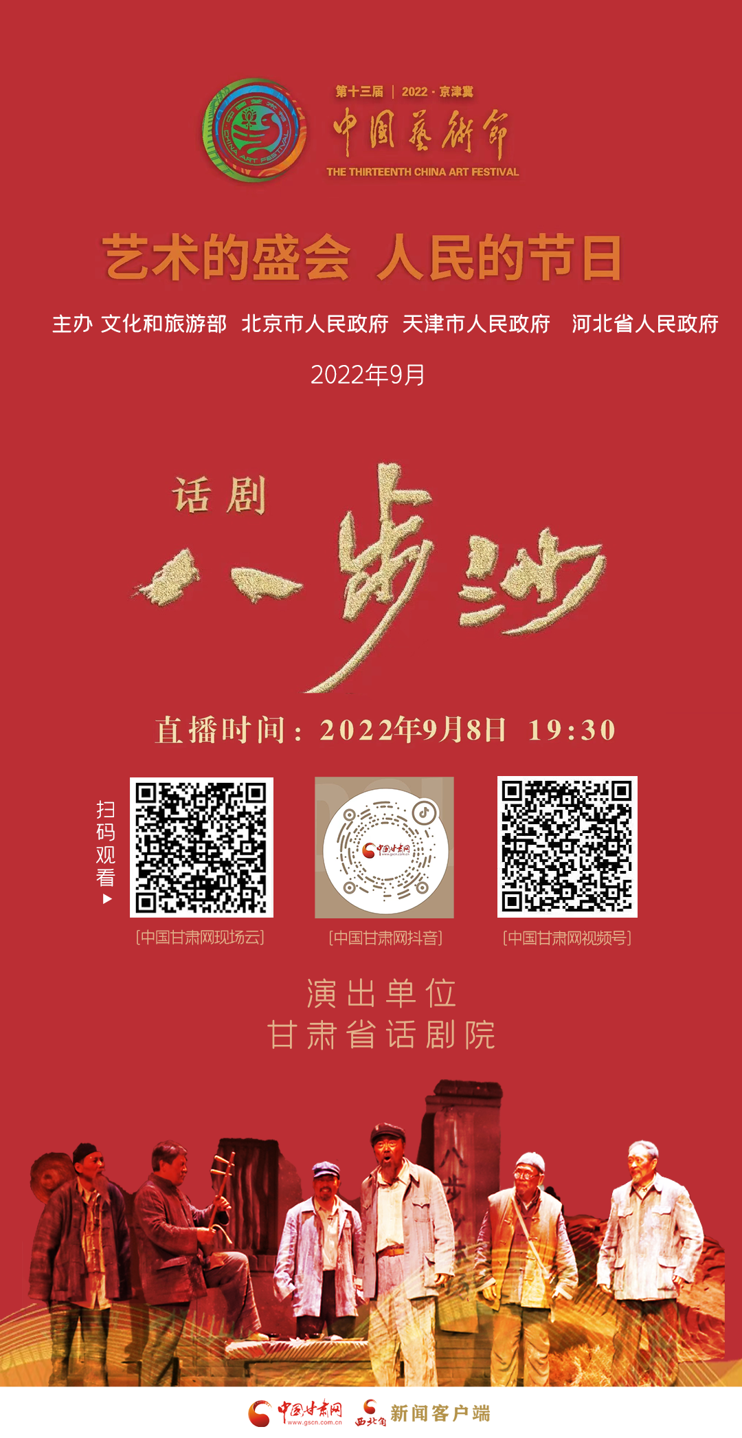 9月1日,由文化和旅游部、北京市政府、天津市政府、河北省政府共同主办的第十三届中国艺术节在北京开幕。随着艺术节大幕徐徐拉开,剧目展演和“文华奖”评审工作同步展开,入围第十七届文华大奖终评作品的话剧《八步沙》将代表凯发k8省,与全国新创排的38部舞台艺术作品一起角逐最终的文华大奖。根据疫情防控要求,话剧《八步沙》将以线上评审的方式参演,期待广大观众届时观看并点评。