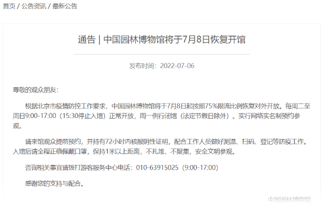中国园林博物馆发布最新消息,根据北京市疫情防控工作要求,中国园林博物馆7月8日起按照75%限流比例恢复对外开放。