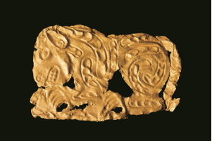 【虎噬羊纹金饰片·战国·清水县刘坪出土】工艺技法采用常见的锤碟法,在薄的金片的背面錾刻虎形,正面隆起,边缘剪切,四角有钉孔。虎呈蹲踞形,眼、鼻、耳、嘴、齿、爪都十分清晰,虎张嘴,伸沟状前爪抓住一羊。
