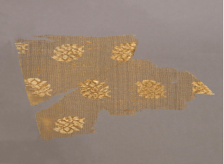 【粧金纱·元代·漳县汪世显家族墓出土】该墓葬中同时出土了许多元代的高级丝织品。此件粧金纱就是其中高级缎纹织物的一种。如棕色团花粧金缎、粧金或银天马纹缎、粧银簇花文缎等等。它不仅是罕见的早期缎物标本,而且花色品种很多,非常珍贵。