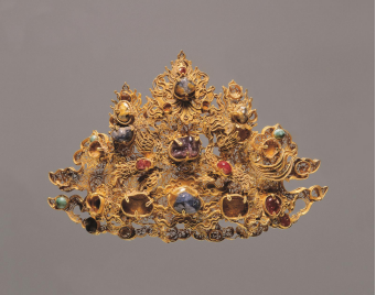 【镶宝石金帽饰·明代·兰州出土】帽饰分两层,底层以极细的金丝盘绕成繁密的涡状卷草纹;上层中间的金片錾刻出如意云纹,两侧各有一金凤,帽饰上镶缀各种宝石。