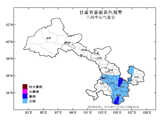 兰州中心气象台2025年07月04日06时18分继续发布暴雨黄色预警:过去24小时我省陇南市东部已出现大暴雨,最大降水量出现在武都裕河129.4毫米,预计未来12小时我省临夏、定西、天水、陇南、平凉等州市部分地方及白银市中南部、兰州市南部、庆阳市北部、甘南州东南部有大雨,其中陇南市南部、天水市西部,定西市东部、平凉市西部、白银市南部、临夏州西部有暴雨,最大累计雨量60-90毫米,强降水将持续至4日17时,最大小时雨强可达20-50毫米。请注意防范强降水可能引发的中小河流洪水、城乡积涝、山洪、滑坡和泥石流等次生灾害。